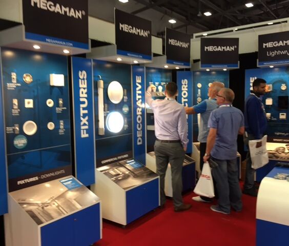 Megaman's new stand design featured a wide variety of working products, that demonstrated the dimming capabilities of many lamps from our extensive LED range. Megaman now offers a full spectrum of fixtures for applications from retail, hotels and restaurants, to homes and offices. A selection of our high performance integrated LED downlights were exhibited on the stand, in addition to our new popular commercial fixtures; the superior IK08 Dino LED Batten and a range of indoor and outdoor LED Bulkheads.