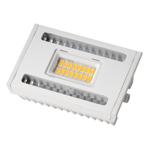 The Megaman LED R7s generates much less heat than its halogen counterparts. Also works with PIRs. Suitable for floodlights or indoor uplighters.